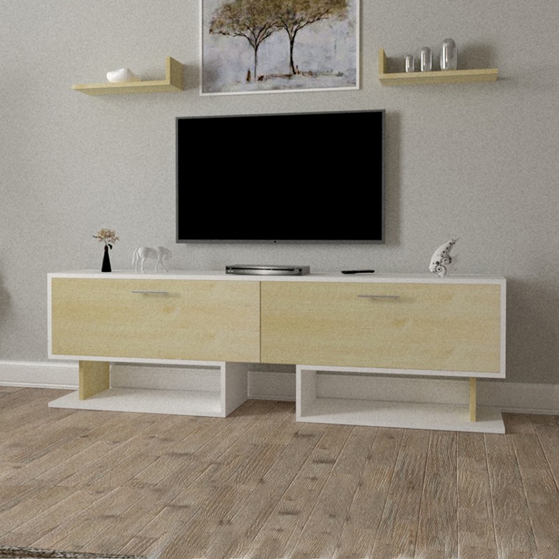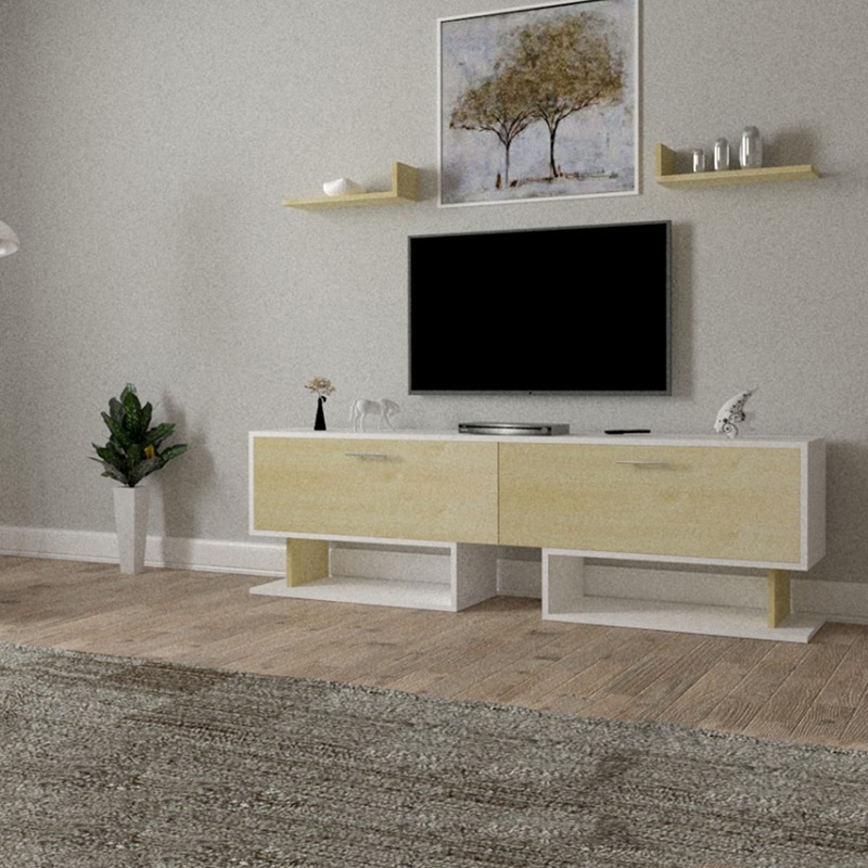 طاولة تلفزيون خشبي مع أبيض ، مع رفوف فخر الصناعة السعودية بتصميم تركي عالية الجودة ، صنعت في المملكة العربية السعودية.