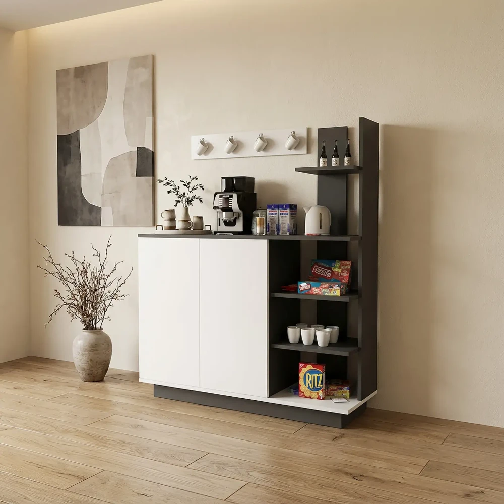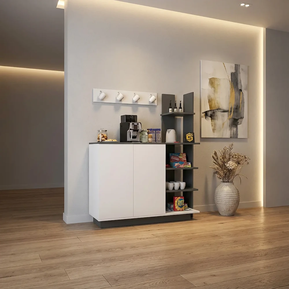 ركن قهوة برفوف لون أبيض مع رمادي، صمم الركن بطريقه عمليه، للاستخدام العملي، فهو يحتوي على درفتان على الجانب الايسر، وأربع أرفف مفتوحه على الجانب الايمن، ويمكن استخدام سطح الركن وعرضه حوالي 120 سم لوضع ماكينه تحضير القهوه، او تحضير المشروبات، بالاضافة الى حامل للمجات يمكن تعليقه اعلى الركن.