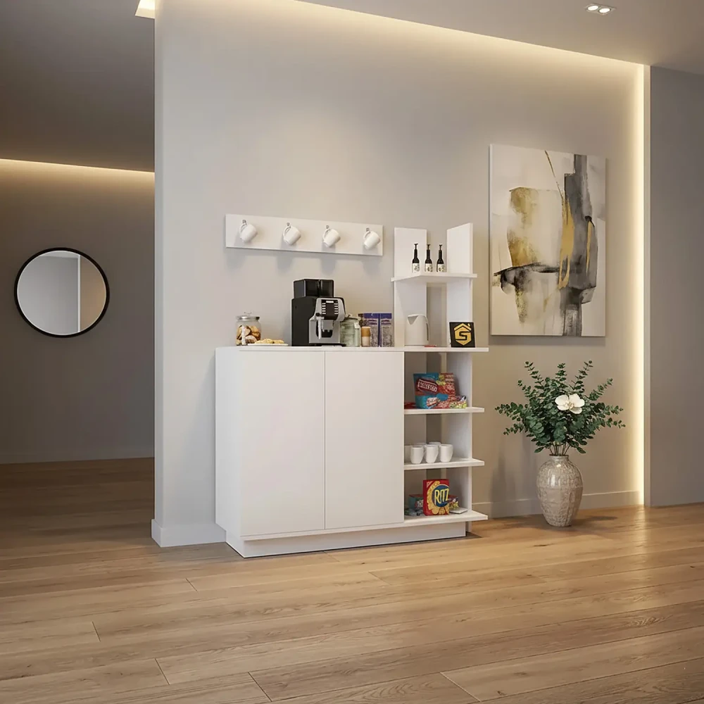 ركن قهوة برفوف لون أبيض، صمم الركن بطريقه عمليه، للاستخدام العملي، فهو يحتوي على درفتان على الجانب الايسر، وأربع أرفف مفتوحه على الجانب الايمن، ويمكن استخدام سطح الركن وعرضه حوالي 120 سم لوضع ماكينه تحضير القهوه، او تحضير المشروبات، بالاضافة الى حامل للمجات يمكن تعليقه اعلى الركن.