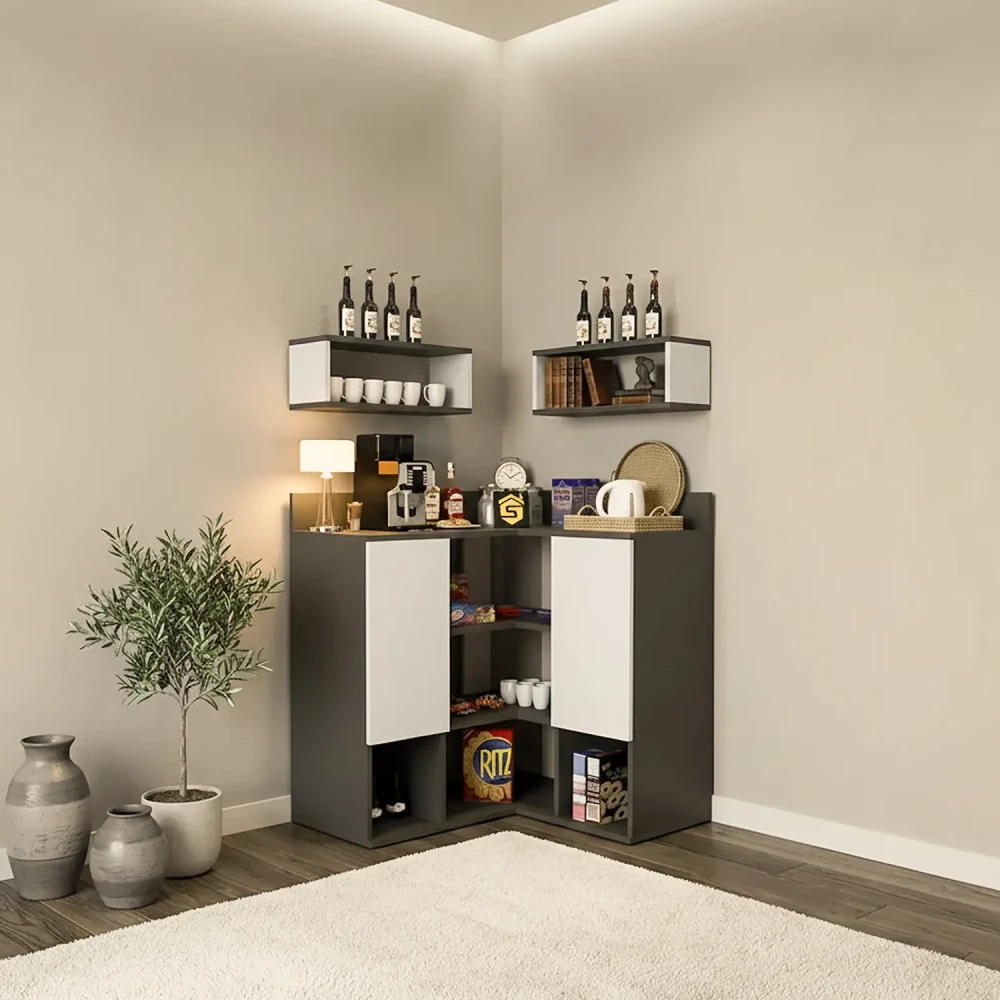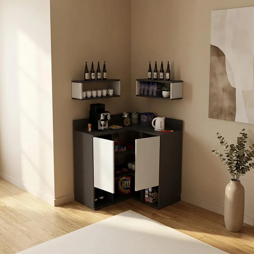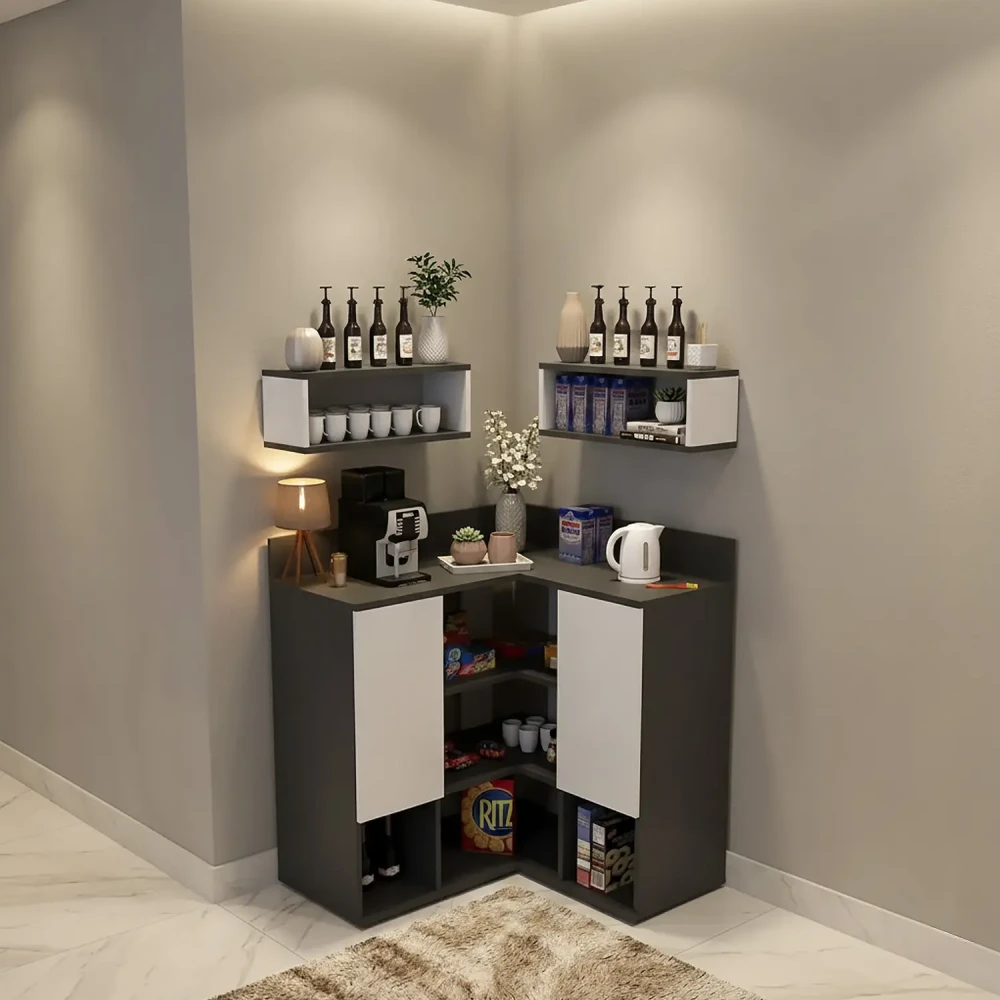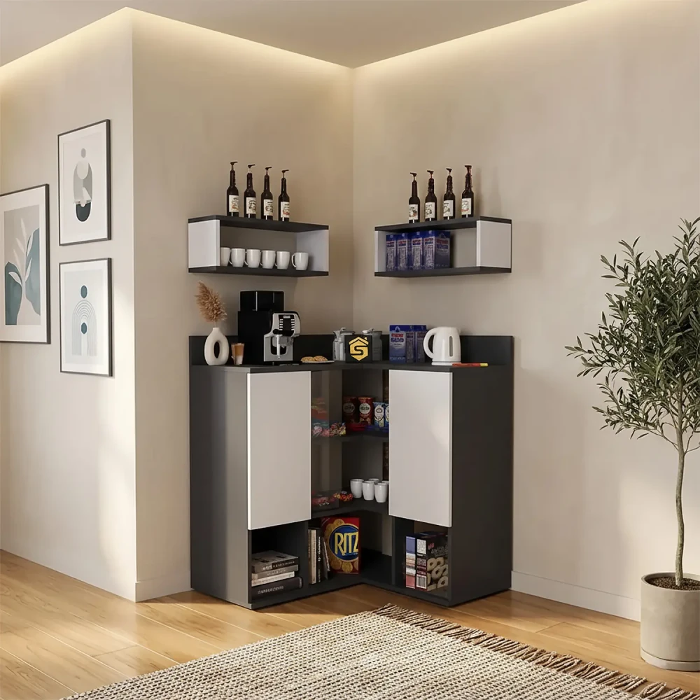 ركن قهوة ديزاين جديد لون أبيض مع رمادي، يتكون الركن من ضلعين ليناسب وضعه فى الاماكن التي يصعب الاستفاده منها مثل الاركان الجدارية، ويحتوي على درفتان وخمسة أرفف مفتوحة، بألاضافة الى وحدتان أرفف تعلق أعلى الركن ليكتمل التصميم العملى.