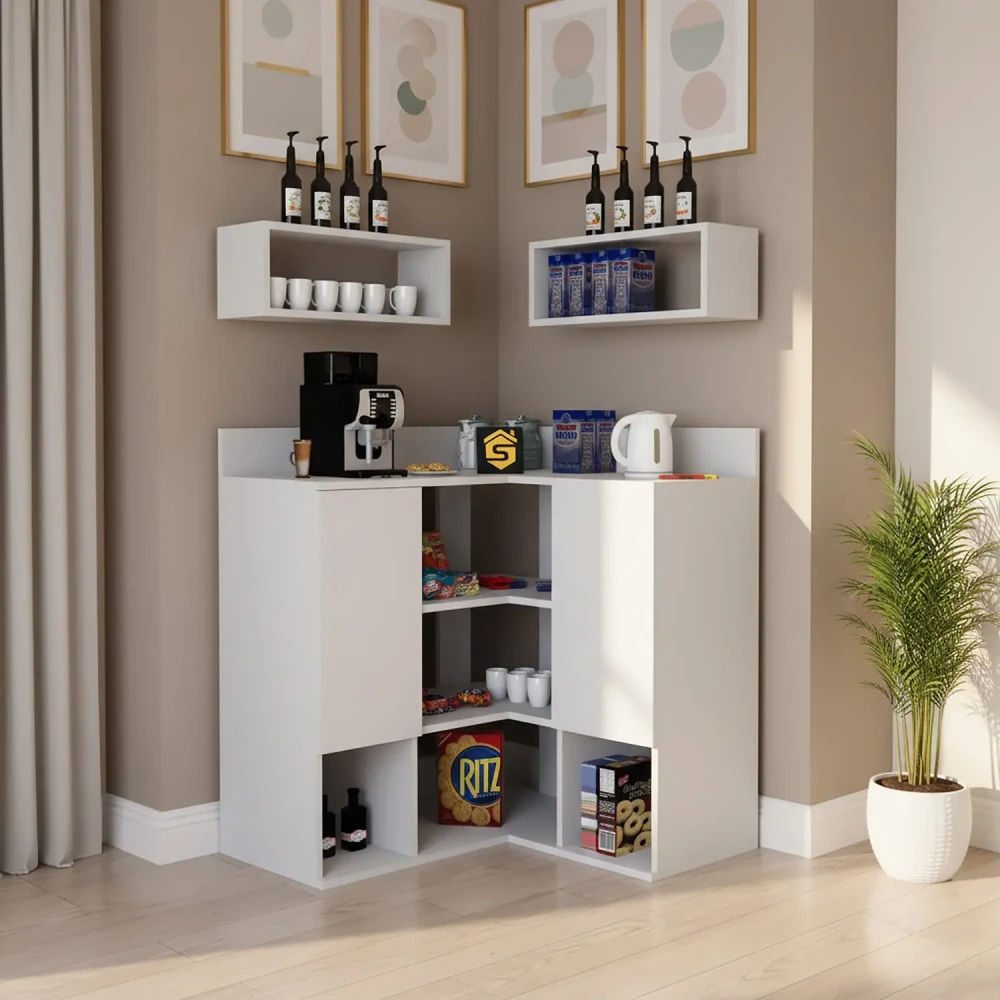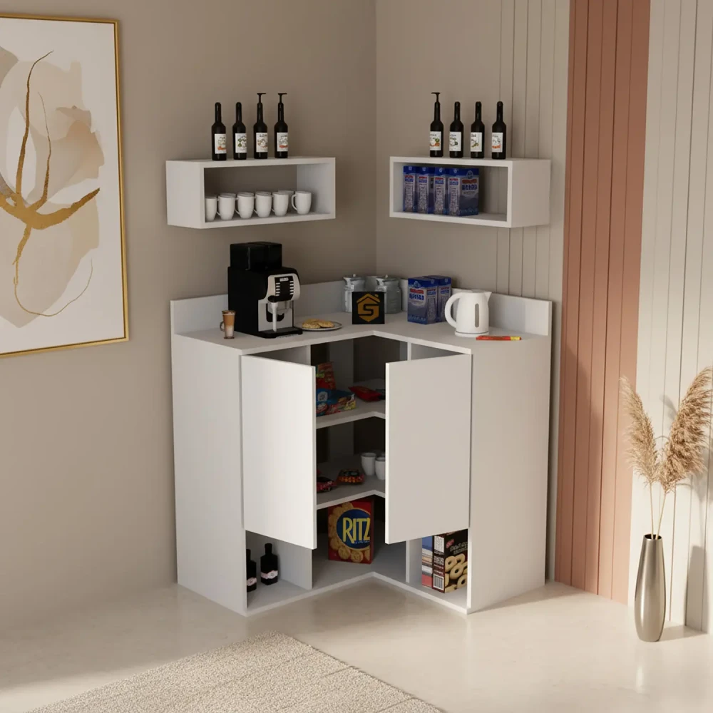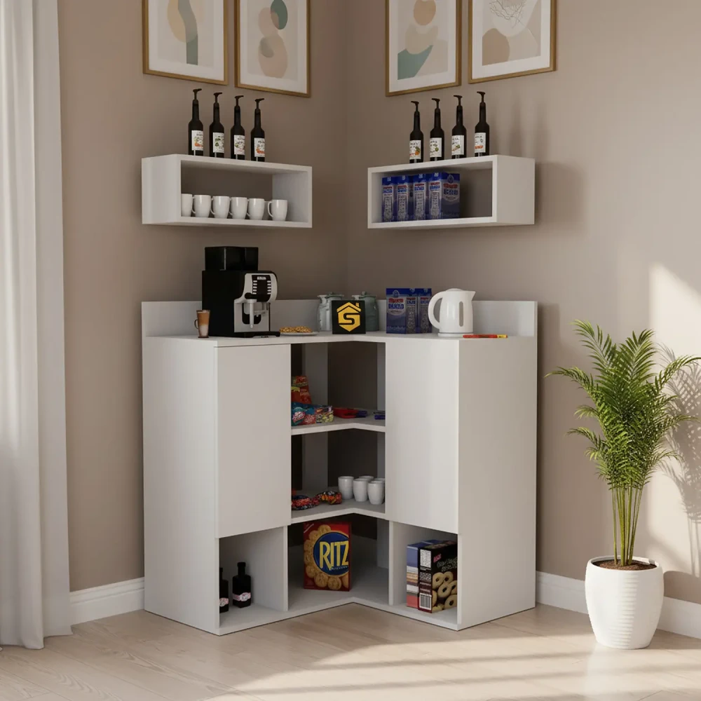 ركن قهوة ديزاين جديد لون أبيض، يتكون الركن من ضلعين ليناسب وضعه فى الاماكن التي يصعب الاستفاده منها مثل الاركان الجدارية، ويحتوي على درفتان وخمسة أرفف مفتوحة، بألاضافة الى وحدتان أرفف تعلق أعلى الركن ليكتمل التصميم العملى.