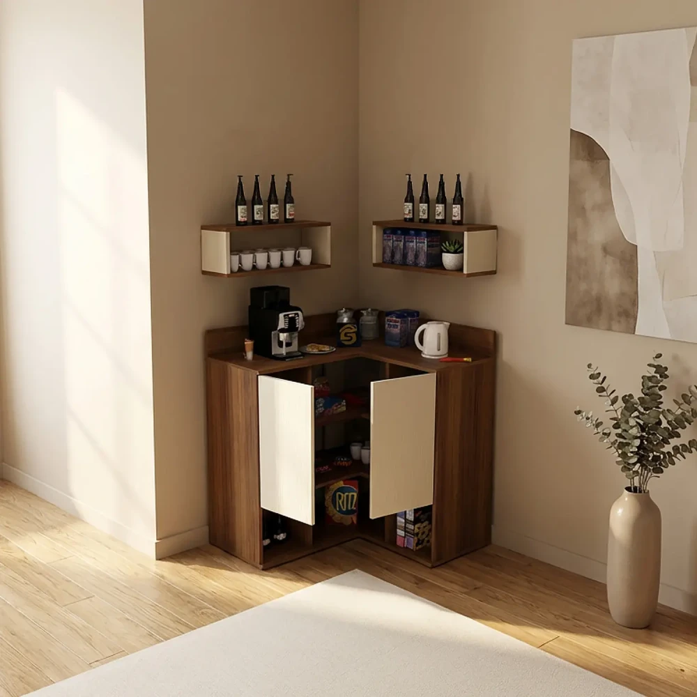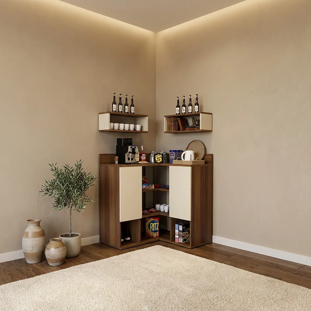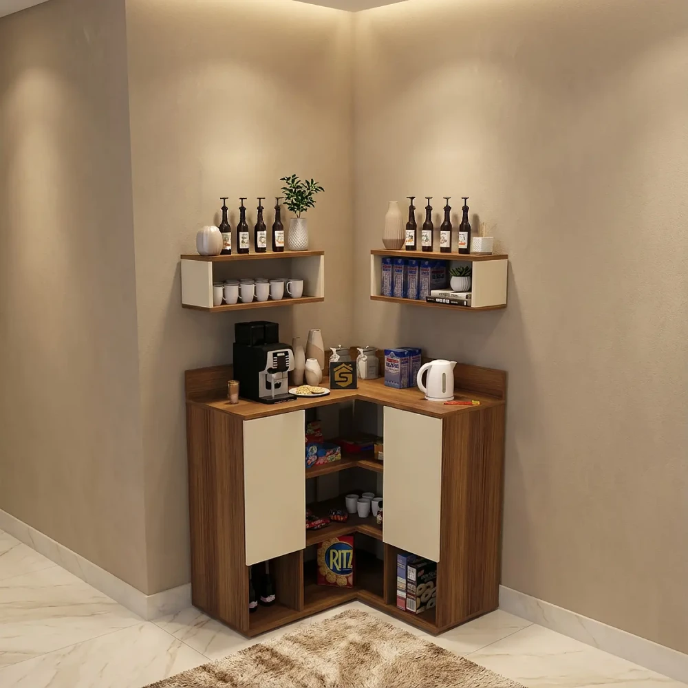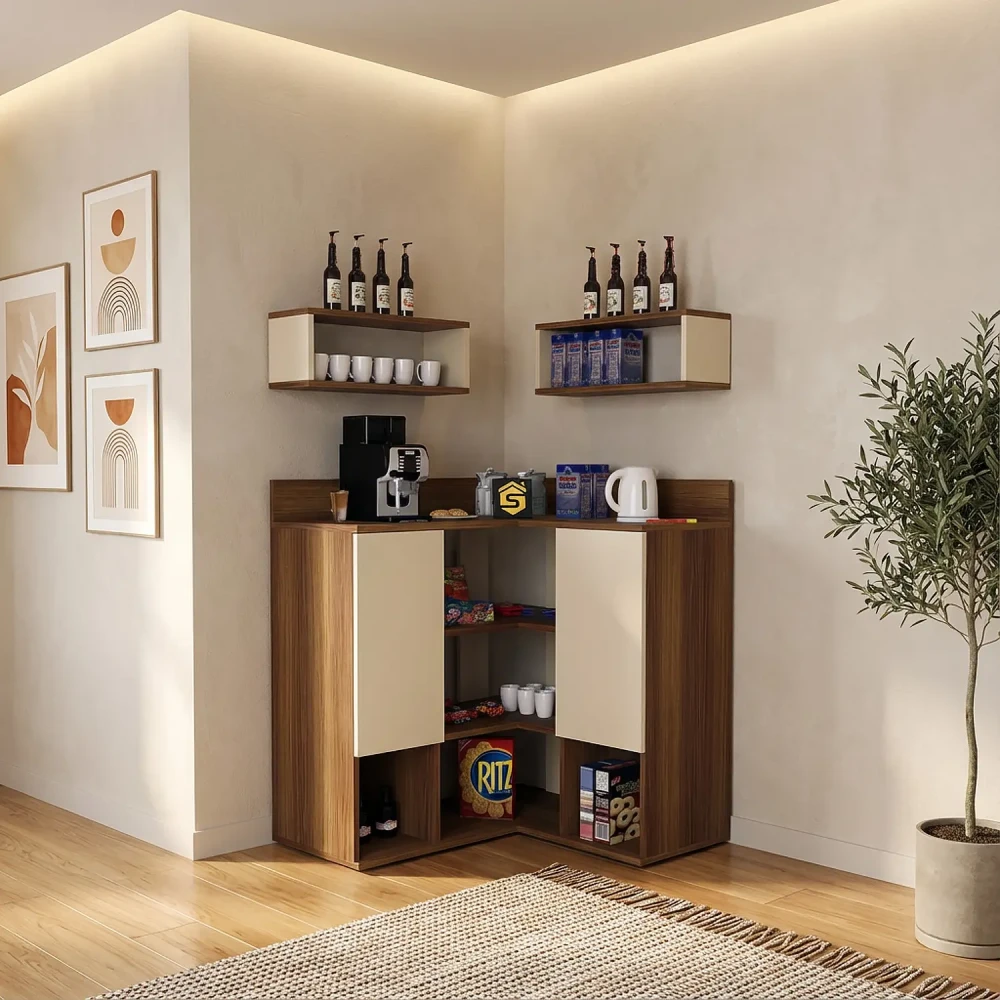 ركن قهوة ديزاين جديد لون بيج مع بني، يتكون الركن من ضلعين ليناسب وضعه فى الاماكن التي يصعب الاستفاده منها مثل الاركان الجدارية، ويحتوي على درفتان وخمسة أرفف مفتوحة، بألاضافة الى وحدتان أرفف تعلق أعلى الركن ليكتمل التصميم العملى.