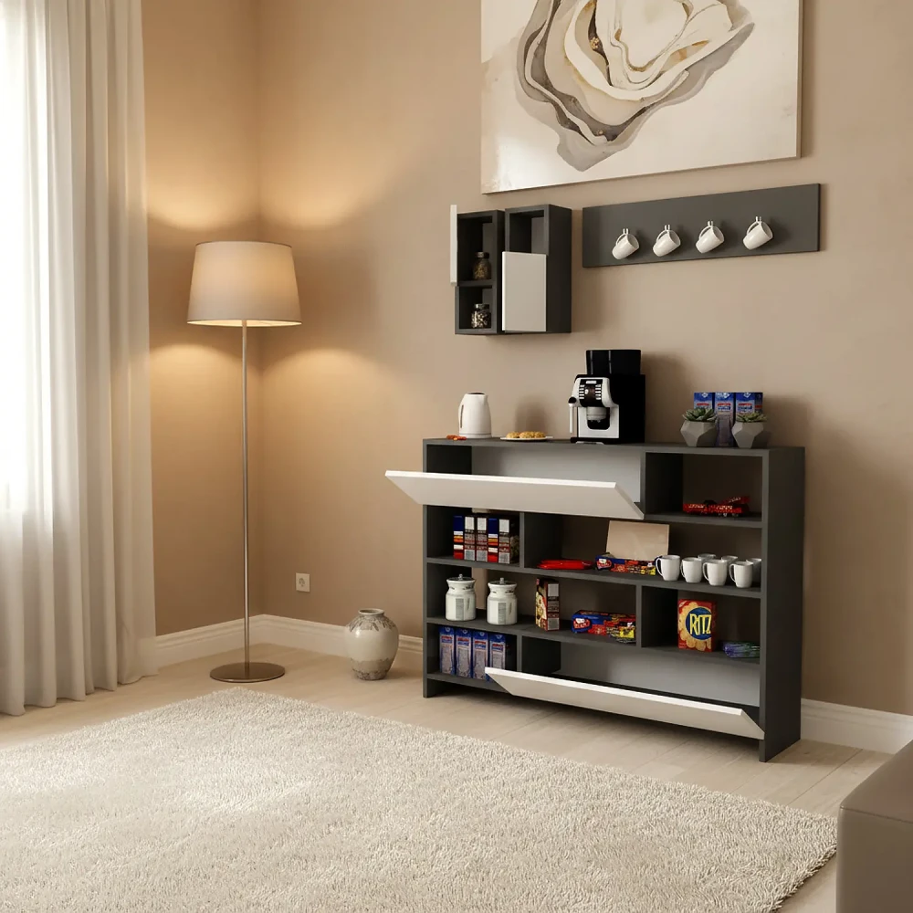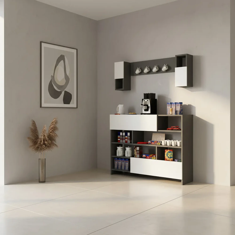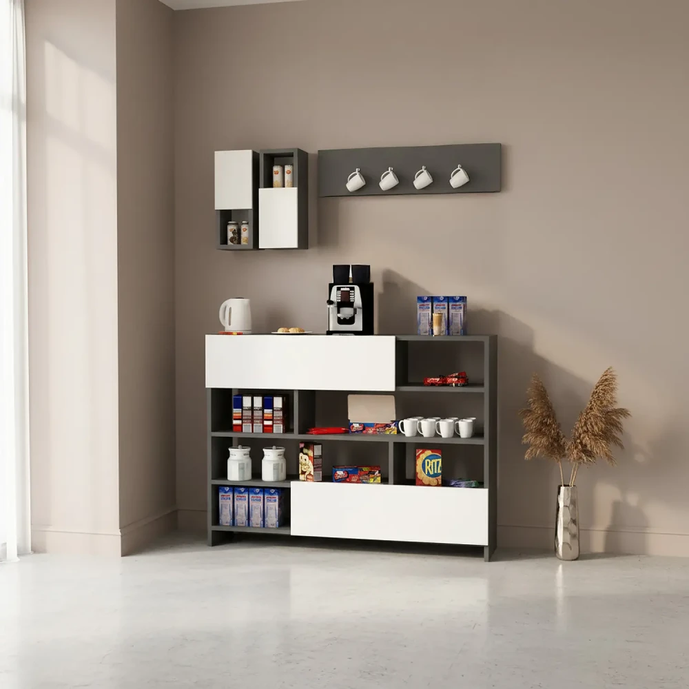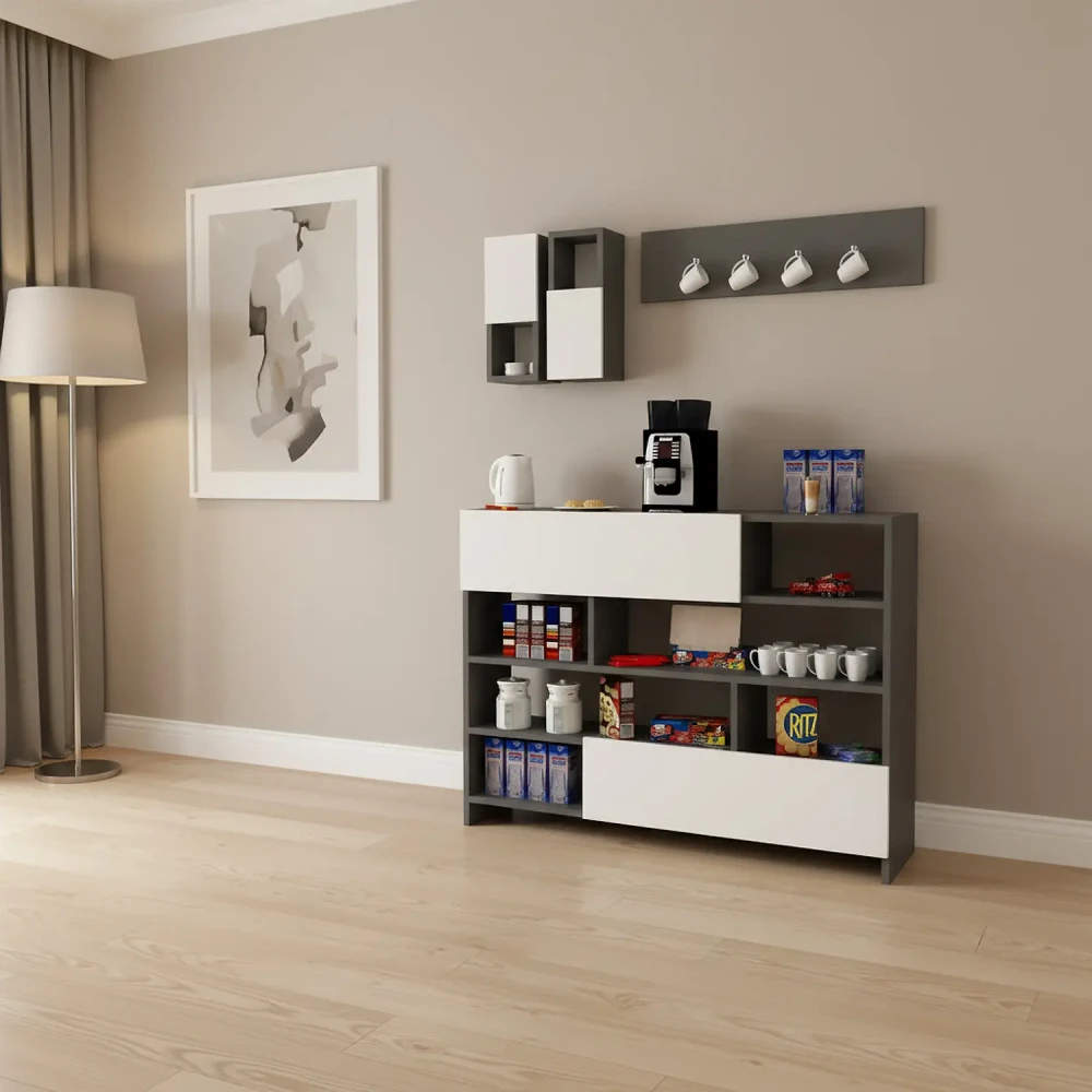 ركن قهوة لون أبيض مع رمادي، ذو استخدام عملي، فهو يحتوي على درفتان وستة أرفف مفتوحة، ويمكن استخدام اعلى ركن القهوه كرف لوضع الاغراض بعرض 120 سم، بالاضافه الى وحدتان أرفف بها درف تعلق على الجدار وحامل للمجات.