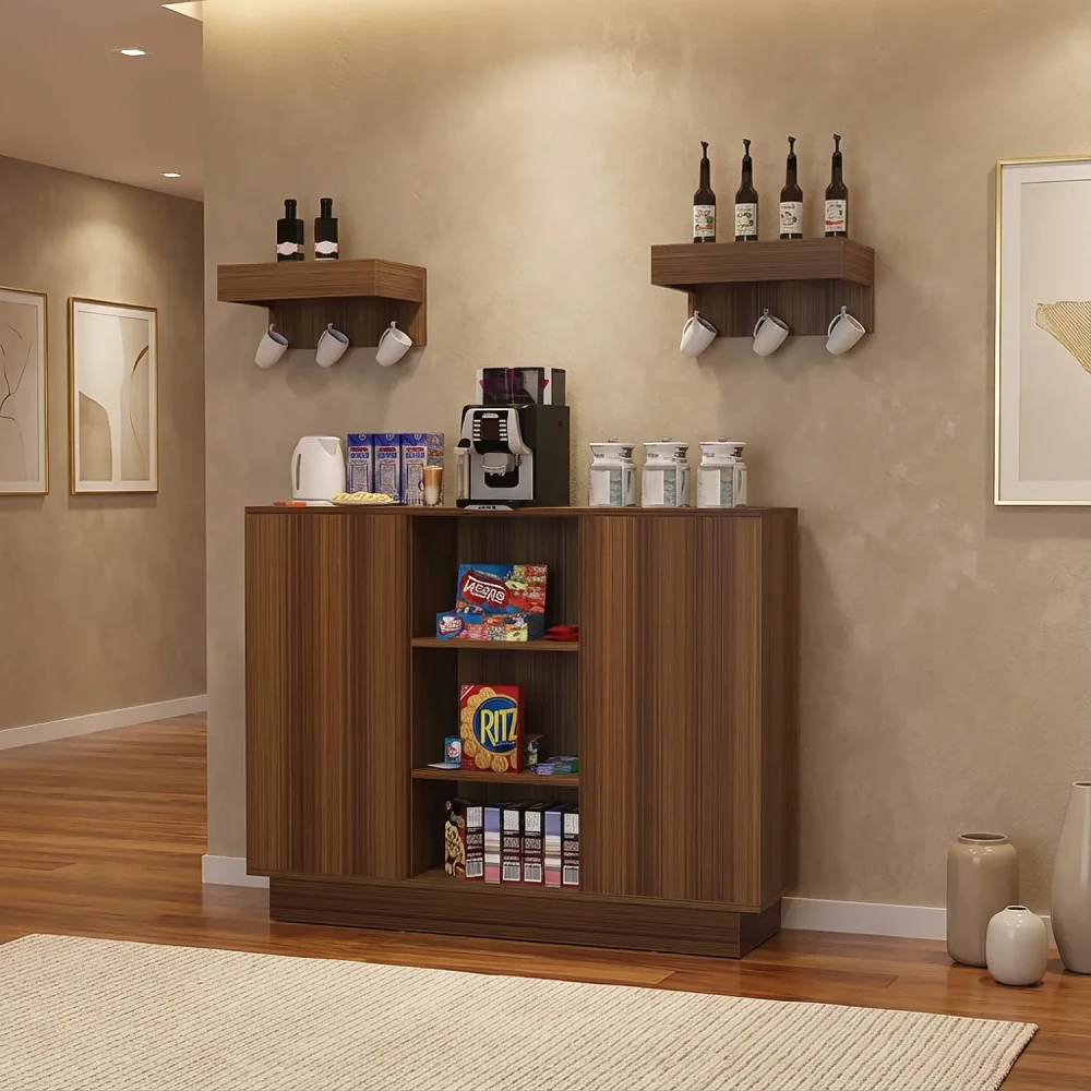 ركن قهوة لون بني، تم تصميم هذا الركن ليكون ذو استخدام عملي، فهو يحتوي على درفتان على الاجناب بداخلهم رف، وثلاثه ارفف مفتوحه فى المنتصف، ويمكن استخدام اعلى ركن القهوه كرف لوضع الاغراض بعرض 120 سم، بالاضافه الى رفين يمكن تعليقهم على الجدار بحامل للمجات، وتم التصميم باللون البني.