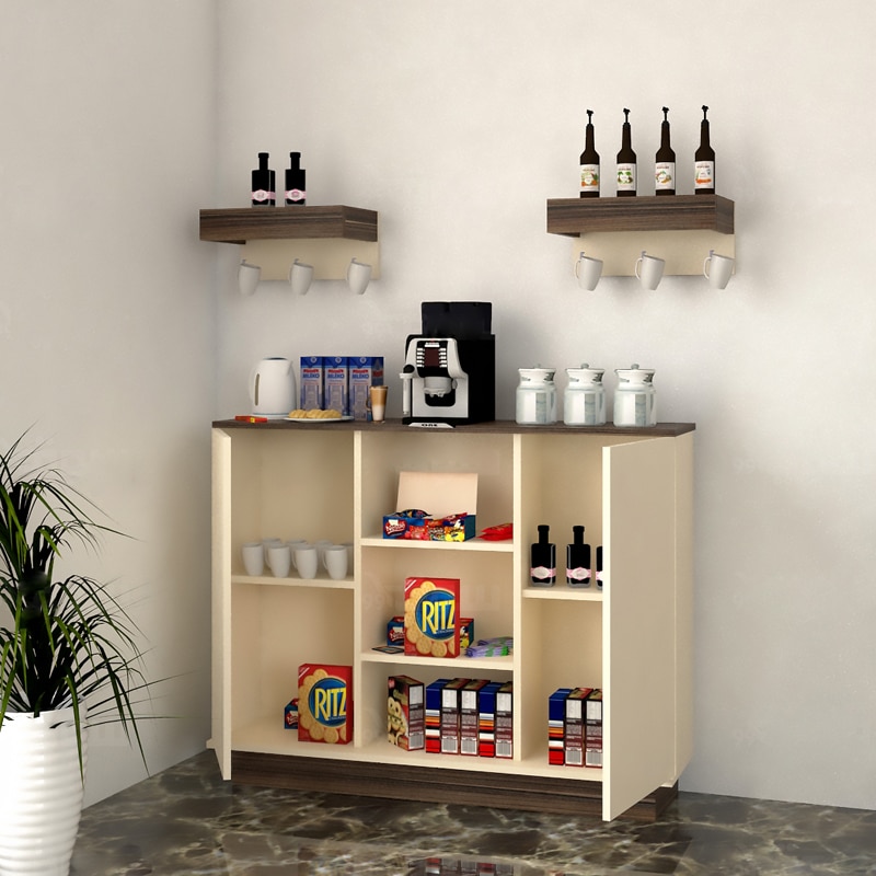 ركن قهوة لون بيج مع بني، تم تصميم هذا الركن ليكون ذو استخدام عملي، فهو يحتوي على درفتان على الاجناب بداخلهم رف، وثلاثه ارفف مفتوحه فى المنتصف، ويمكن استخدام اعلى ركن القهوه كرف لوضع الاغراض بعرض 120 سم، بالاضافه الى رفين يمكن تعليقهم على الجدار بحامل للمجات، وتم التصميم باللون البيج مع اللون البني.