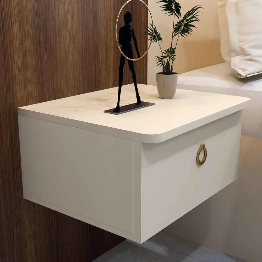 يمتزج اللون الأبيض مع تفاصيل الخشب البني ليخلق تناغمًا بصريًا هادئًا يناسب غرف النوم الحديثة. كما أن تصميم الكومودينو المعلق يضيف لمسة عملية، حيث يسهّل تنظيف الأرضية ويمنح الغرفة إحساسًا بالاتساع والتنظيم.