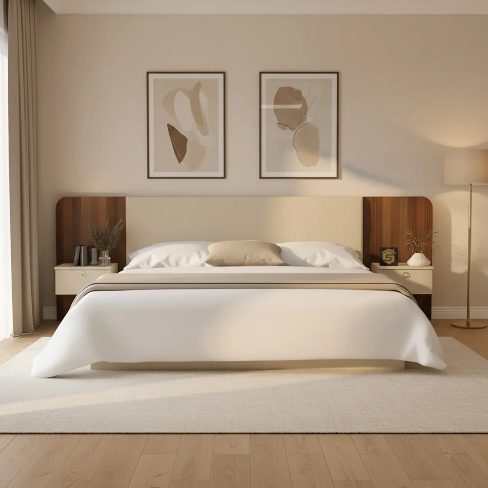 سرير مودرن بتصميم فاخر مع 2 كومودينو معلق وديكور جداري – أبيض وبني