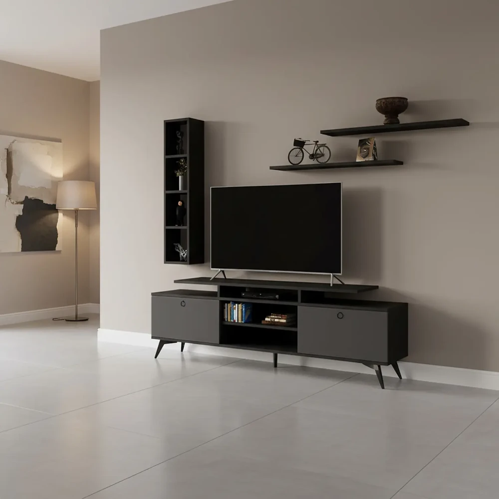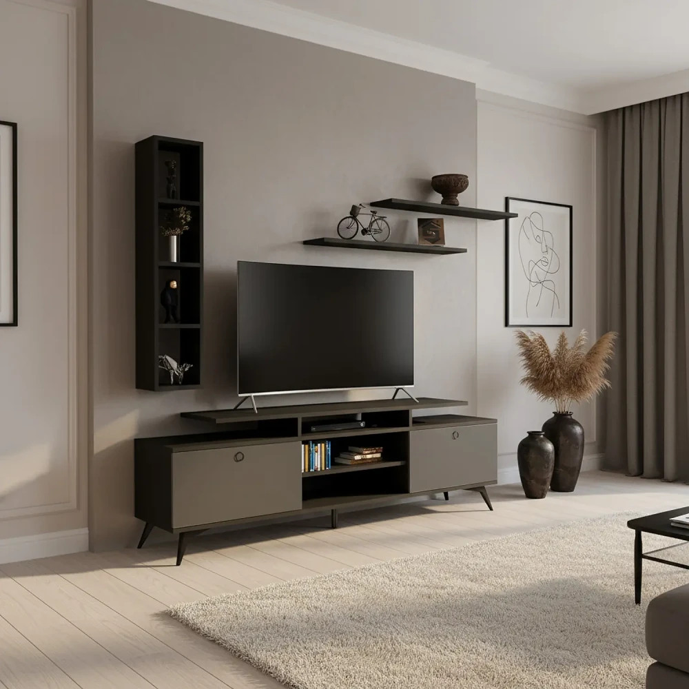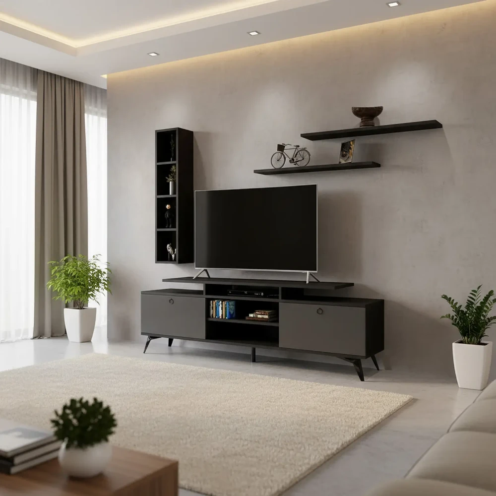 طاولة تلفاز عصرية لون أسود مع رمادي فخر الصناعة السعودية بتصميم تركي عالية الجودة، صنعت في المملكة العربية السعودية.