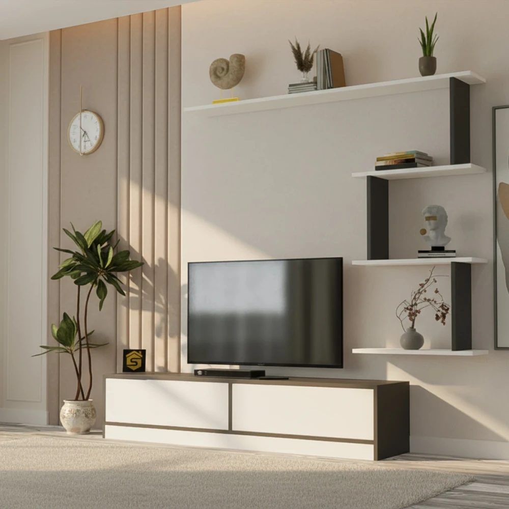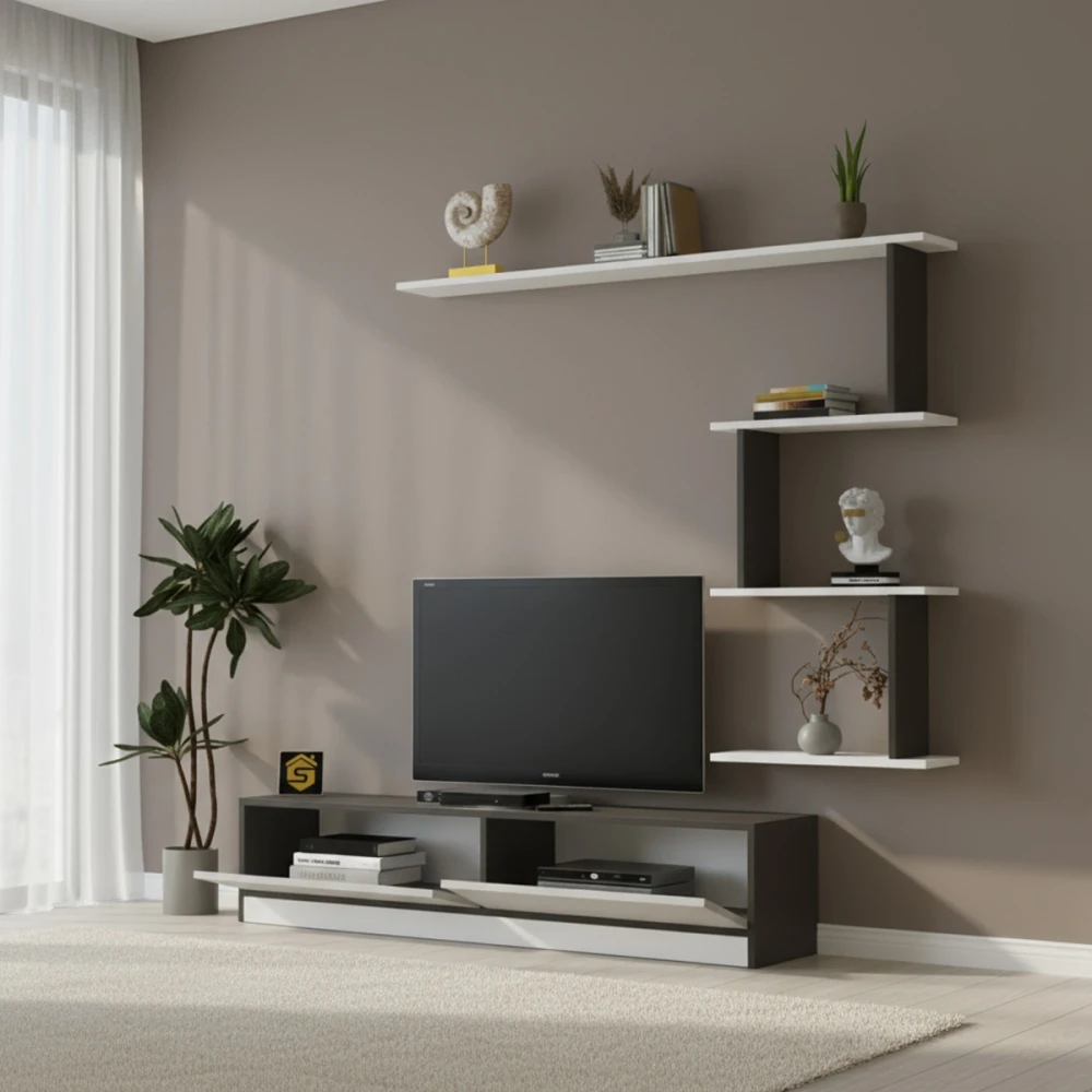 تتكون هذه الطاولة من قطعة أسفل الشاشة، ومعها رفوف يتم تعليقها على الجدار ليكتمل التصميم، مما يعطي الشكل طابع تركي مميز.