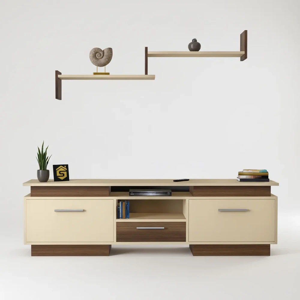 طاولة تلفزيون تصميم تركي حديث، تتميز بألوانها المتناسقه، اللون البيج مع اللون البني، هذه الطاوله تتكون من درفتين خزانه كبيره، ودرج كبير، ورف يمكن استخدامه فى اغراض عديده، ورف اخر مفتوح داخل الطاوله لسهوله تمرير الاسلاك منه، يمكن استخدامه فى وضع اجهزه الالعاب او اجهزه التحكم عن بعد، مع رف أعلى مكان الشاشه.