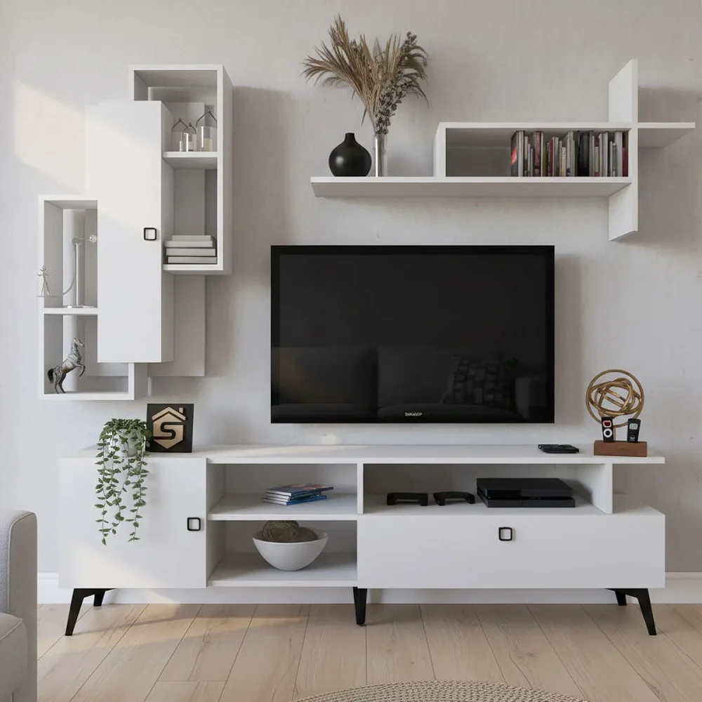 تتكون هذه الطاولة من قطعة أسفل الشاشة ، ومعها رفوف يتم تعليقها على الجدار ليكتمل التصميم ، مما يعطي الشكل طابع تركي مميز