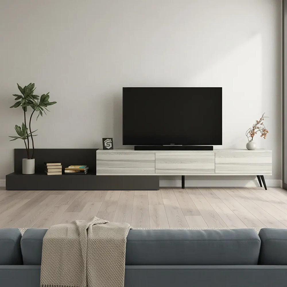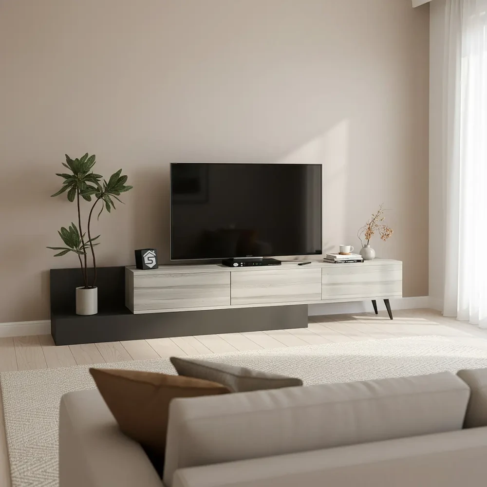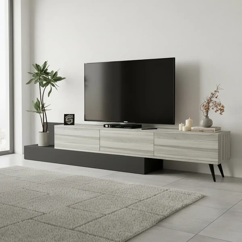 طاولة شاشة رمادي درجتين، تعتبر هذه الطاولة واحدة ضمن مجموعة طاولات تلفزيون بلازما تصميم تركي مميز وصناعة سعودية ، تم تصنيعها بعناية داخل السعودية، وتم استخدام أجود انواع الخشب التيلندى الذي يتم استخدامه في تصنيع طاولات تلفزيون مميزة وعالية الجودة.