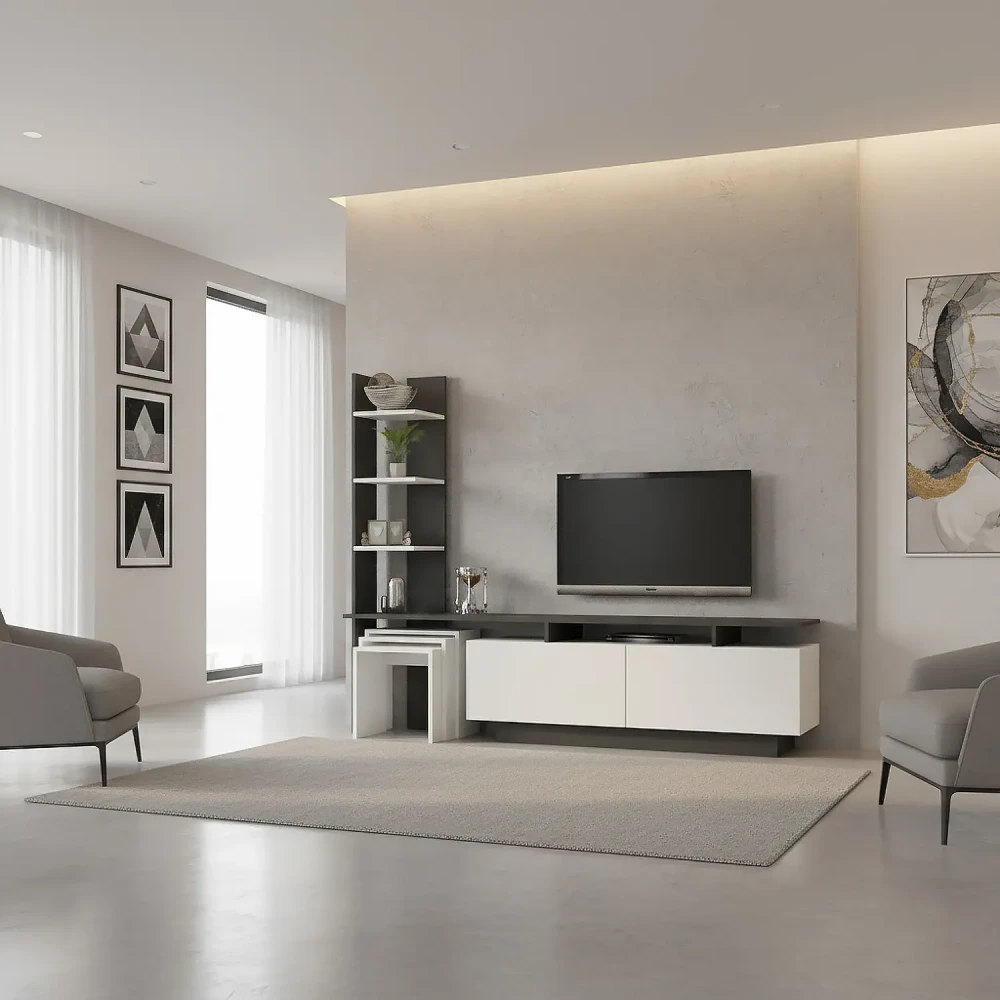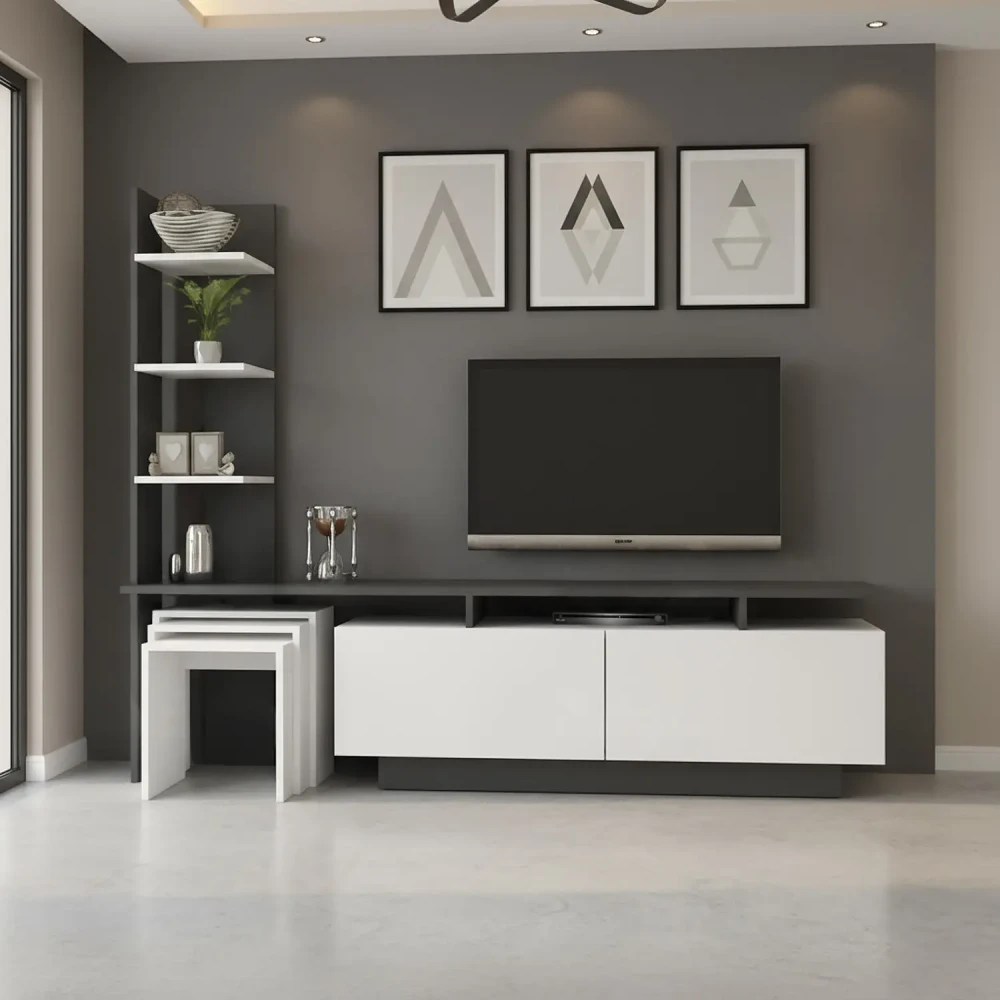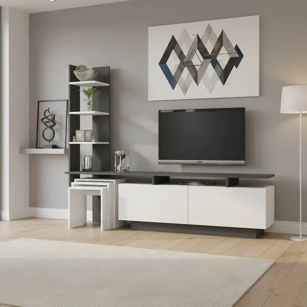 طاولة شاشة مع 3 طاولات خدمة، طاولة عملية، باللون ألابيض مع اللون الرمادي، تتكون من درفتان كبيرتان، وقطعة أعلاهم تشكل رف منخفض الارتفاع، مناسب لوضع أجهزة التحكم عن بعد، وأجهزه الالعاب، وأرفف جانبية تميز التصميم بلمسة جمالية، بالاضافة الي 3 طاولات خدمة، يتم تخزينهم اسفل الطاولة.