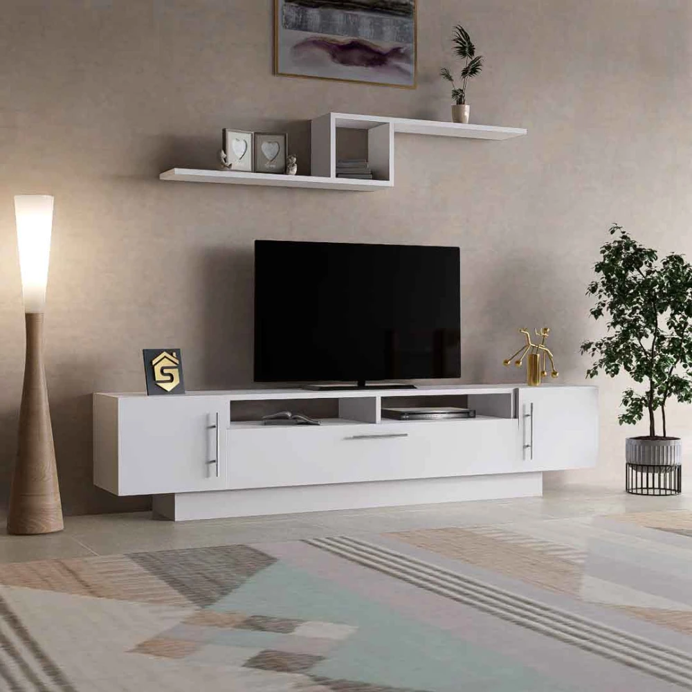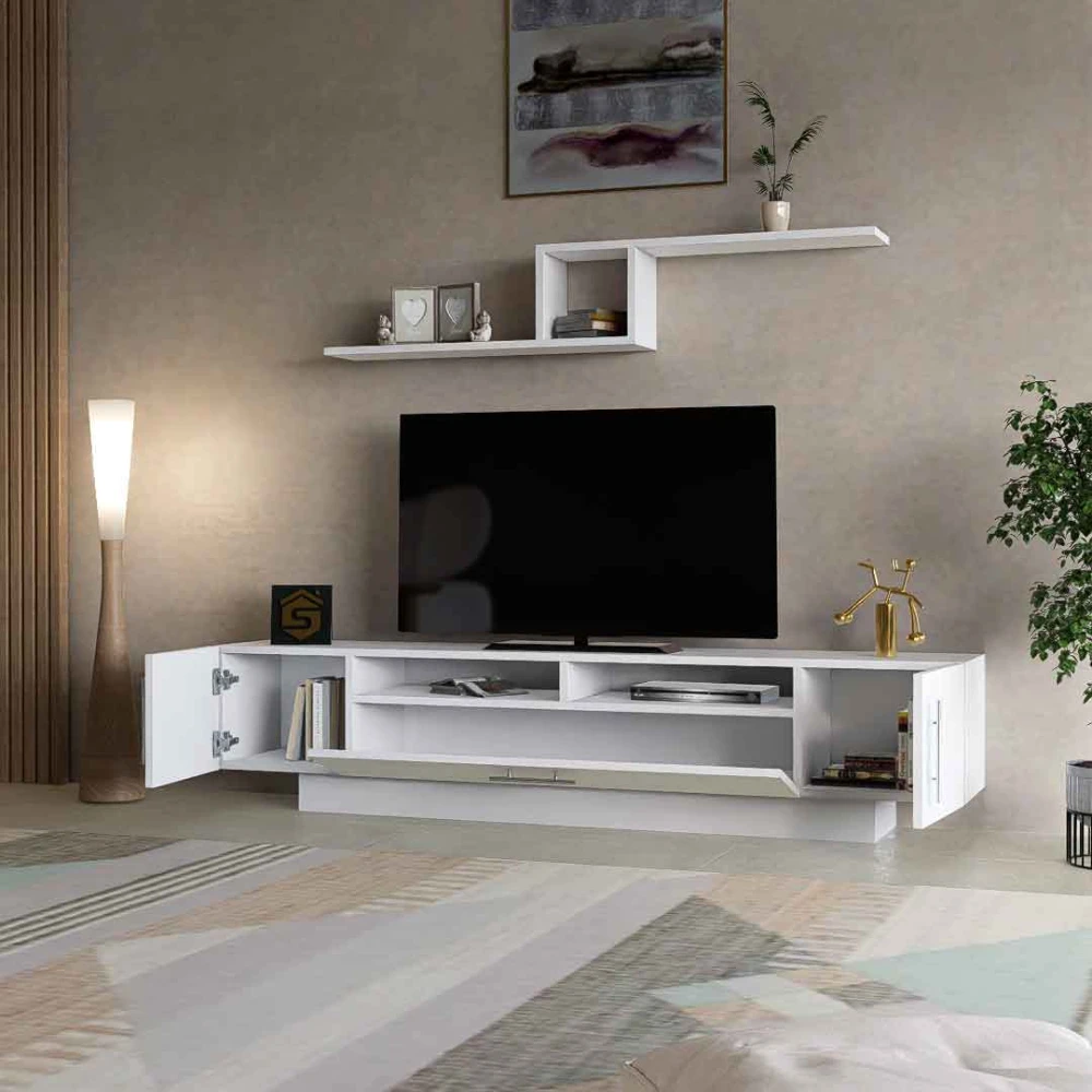 طاولة شاشة مودرن بيضاء، تم تصميمها كي تكون طاولة متعددة الوظائف، من خلال اضافة أرفف خشبية مثبتة فوق التلفاز حيث يكون التلفزيون مثبت على الحامل او فوق الطاوله ويوجد ثلاثه خزائن متعددة الاستخدام، مع وجود رفين داخل الطاوله يمكن استخدامهم فى وضع اجهزه التحكم عن بعد او اجهزه الالعاب، وهي وحدة حديثة وبسيطة ومتعددة الاستخدامات