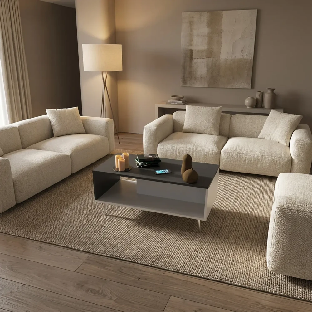 طاولة قهوة لون أبيض مع رمادي، تم تصميم الطاولة على احدث التصاميم العصرية، وهي تحتوي على رف من الاسفل يمكن استخدامة حسب الحاجة، بتصميم تركى عصري حديث.