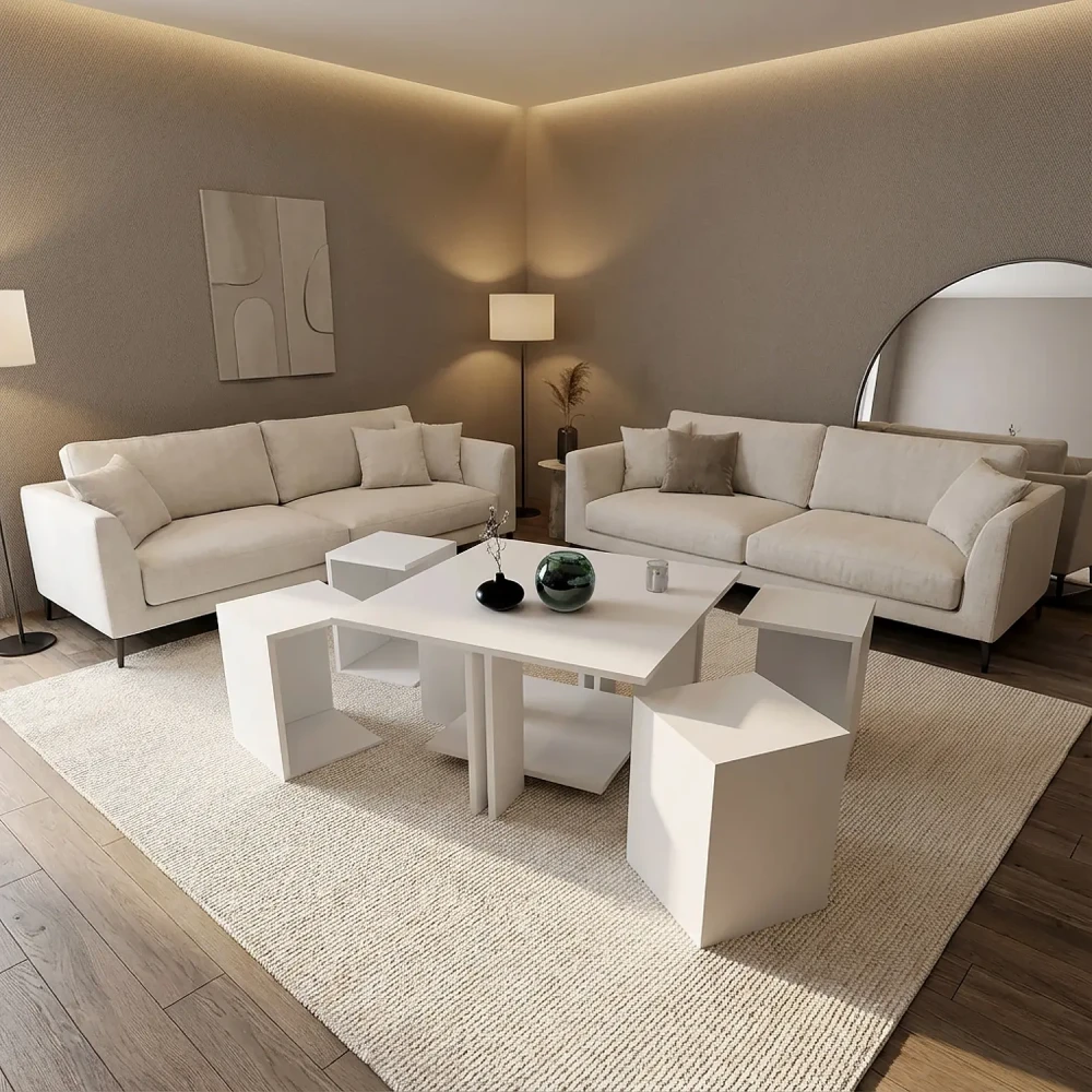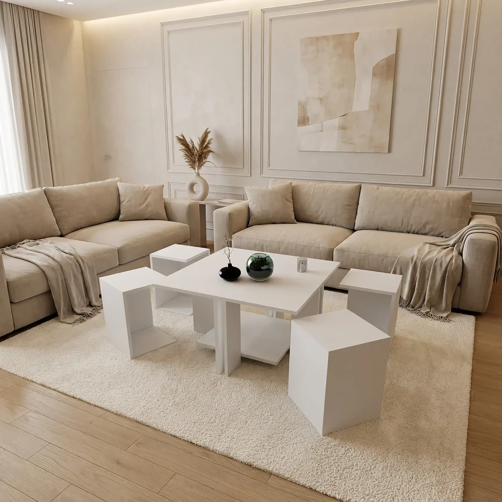 طاولة قهوة لون أبيض، طاولة ذكيه متعددة الاستخدام، تحتوي على اربع طاولات خدمة يمكن وضعهم بشكل مرتب ومنظم بداخلها، بتصميم تركى عصري حديث.