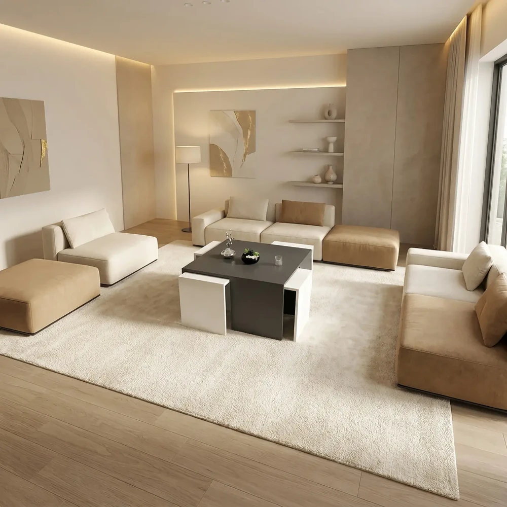 طاولة قهوة مع 4 طاولات خدمة لونين، صممت الطاوله باللون الرمادي واللون ألابيض، فهي طاولة ذكيه متعددة الاستخدام، تحتوي على اربع طاولات خدمة يمكن وضعهم بشكل مرتب ومنظم بداخلها، بتصميم تركى عصري حديث.