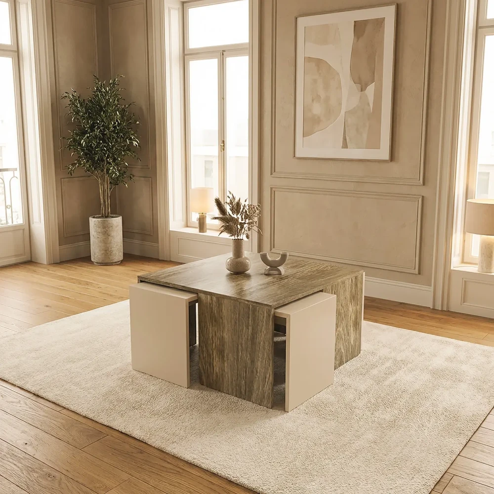 طاولة قهوة مع 4 طاولات خدمة لونين، صممت الطاوله باللون البيج، واللون الخشبي، فهي طاولة ذكيه متعددة الاستخدام، تحتوي على اربع طاولات خدمة يمكن وضعهم بشكل مرتب ومنظم بداخلها، بتصميم تركى عصري حديث.