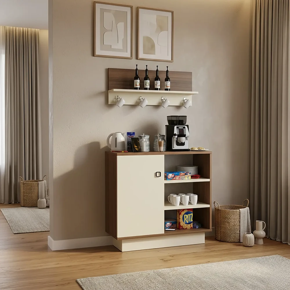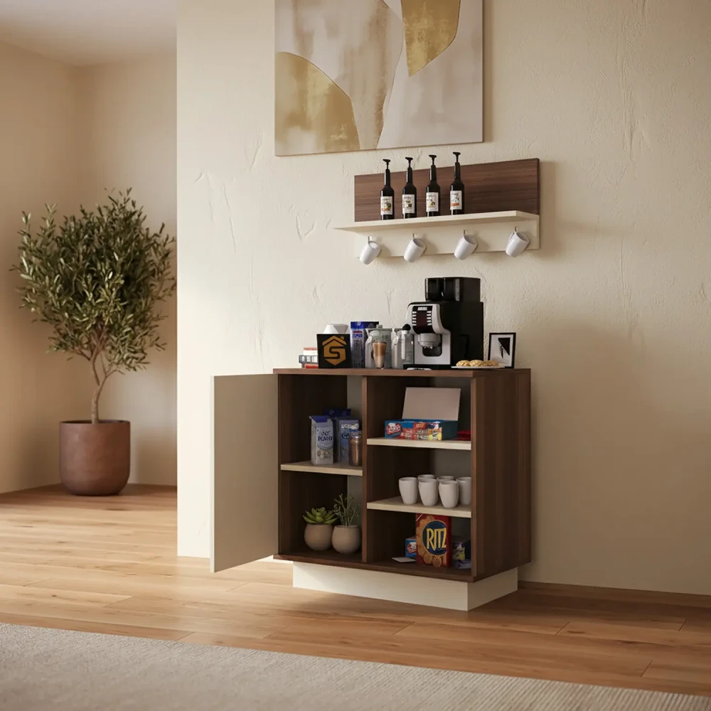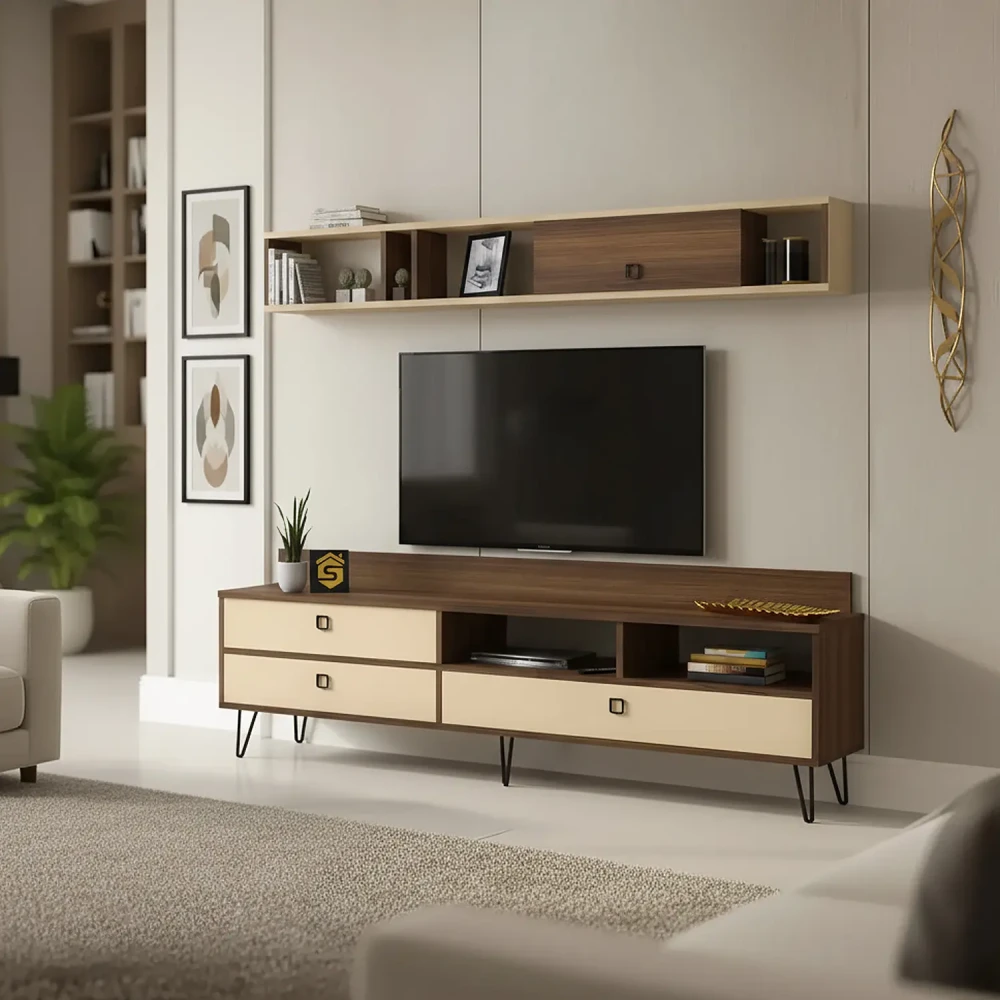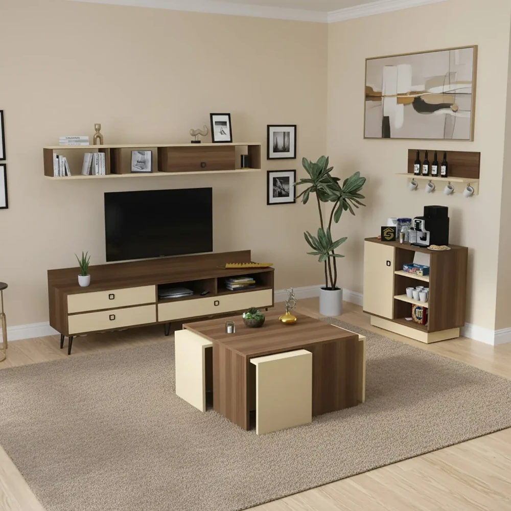 طقم طاولات تلفزيون و قهوة و ركن قهوة، صمم هذا الطقم بلون بيج مع لون بني فاتح، ويتكون هذا الطقم من طاوله تلفزيون، تحتوى على ثلاثة درف ورفين مفتوحين بتصميم مميز، معها وحدة رف بها درفة تعلق على الجدار اعلى الطاولة، وطاوله قهوه بها أربع طاولات خدمه، متعددة الاستخدامات، وركن قهوه به درفة وثلاثة ارفف مفتوحه يمكن استخدامه فى اغراض عديدة، مع رف مزود بحامل للمجات بعرض حوالي 80 سم .