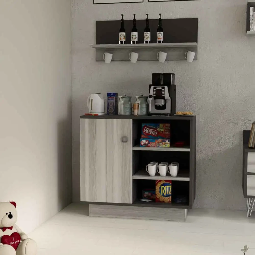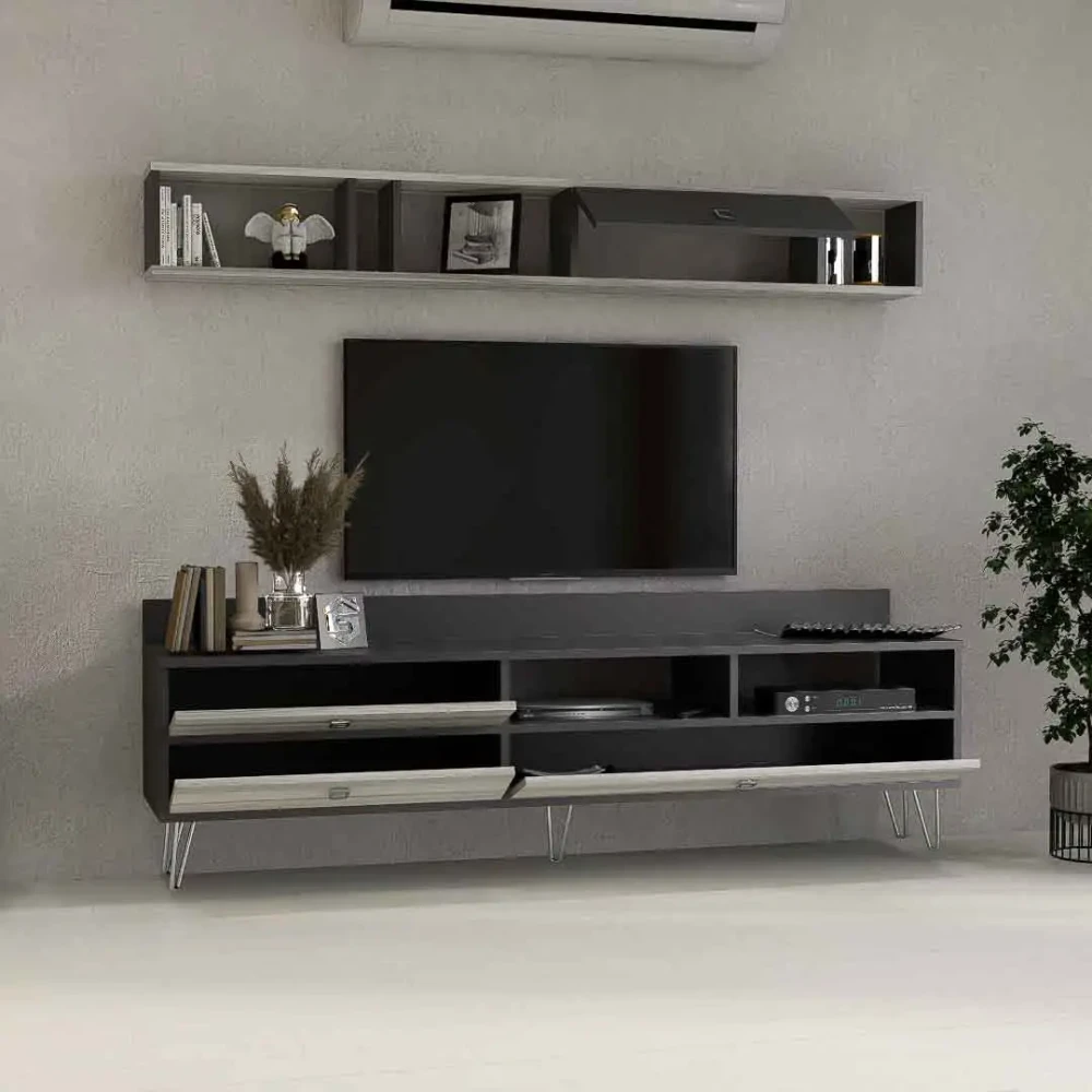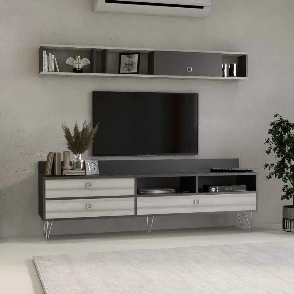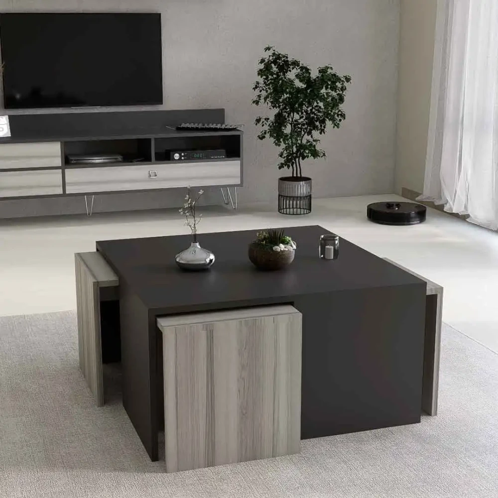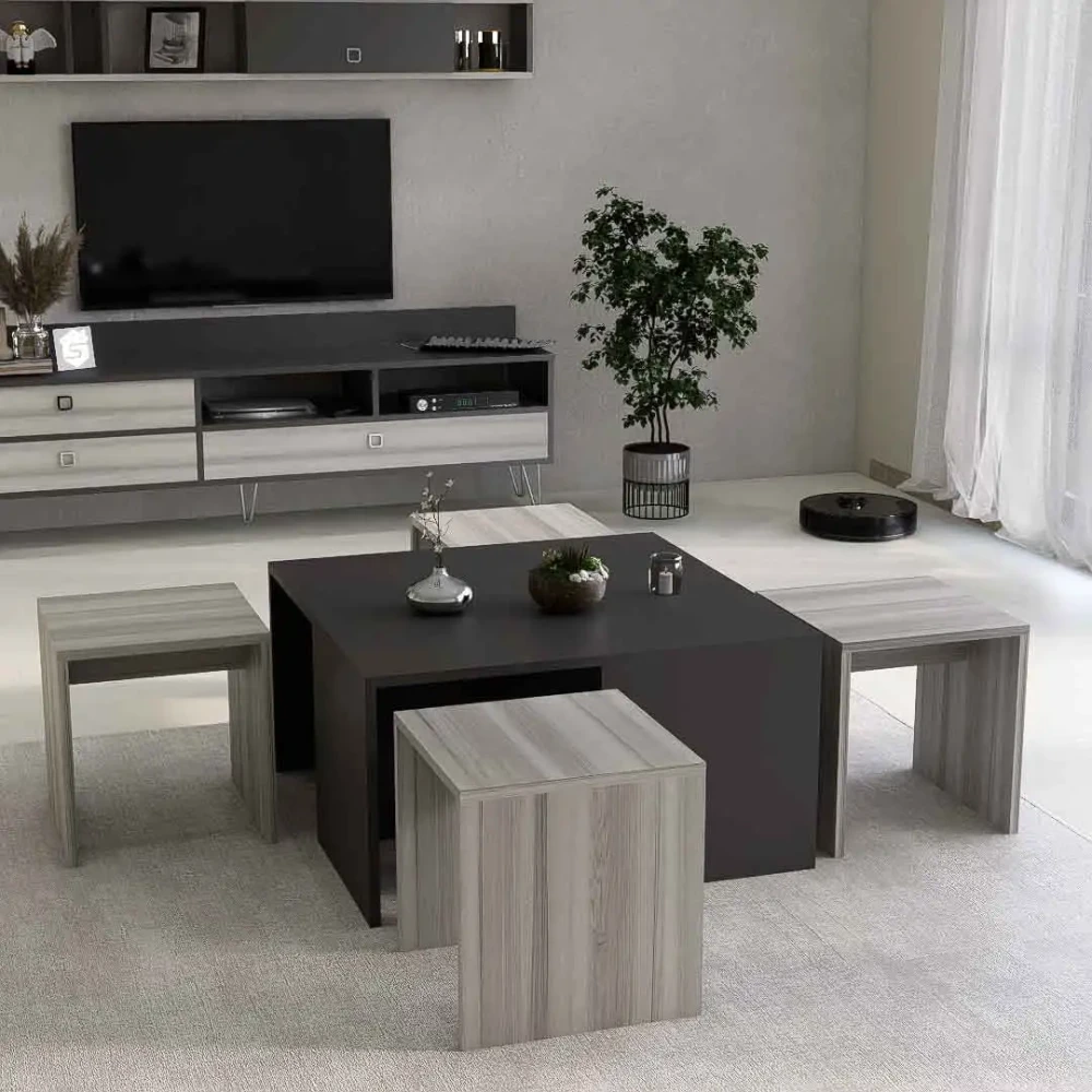 طقم طاولات تلفزيون و قهوة و ركن قهوة، صمم هذا الطقم بلون رمادي درجتين، ويتكون هذا الطقم من طاوله تلفزيون، تحتوى على ثلاثة درف ورفين مفتوحين بتصميم مميز، معها وحدة رف بها درفة تعلق على الجدار اعلى الطاولة، وطاوله قهوه بها أربع طاولات خدمه، متعددة الاستخدامات، وركن قهوه به درفة وثلاثة ارفف مفتوحه يمكن استخدامه فى اغراض عديدة، مع رف مزود بحامل للمجات بعرض حوالي 80 سم .
