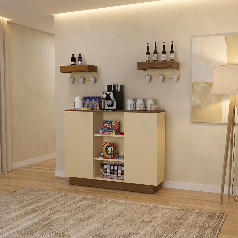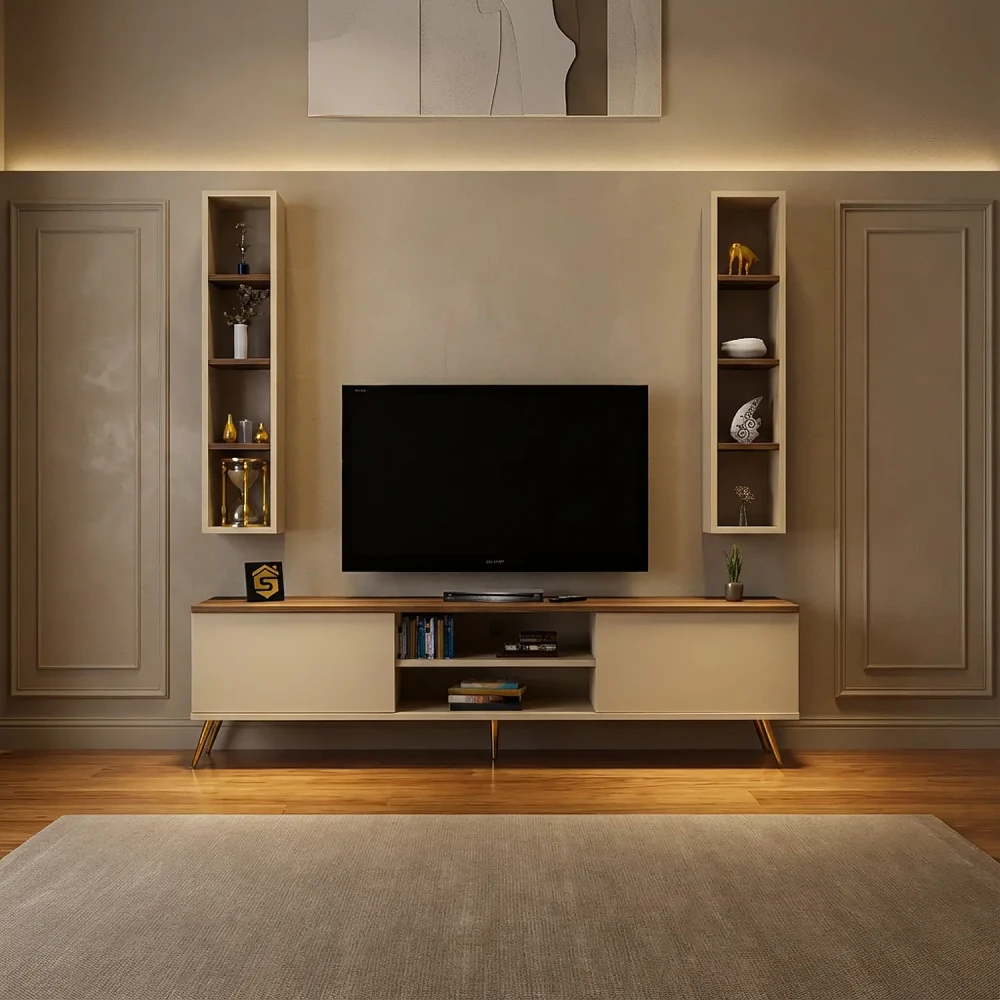 طقم طاولات تلفزيون و قهوة و ركن قهوة، صمم هذا الطقم بلونين من أفضل الالوان المستخدمة في الديكورات المنزلية، ما يعطيها طابع تركى مميز، ويتكون هذا الطقم من طاوله تلفزيون، معها وحدتين ارفف تعلق على الجدار، وطاوله قهوه بتصميم راقي، وركن قهوه ذو استخدامات متعدده، مع رفين خاصين بركن القهوه، مزودين بحامل للمجات وزين هذا الطقم المتكامل بالوان هادئه بطابع تركى حديث.