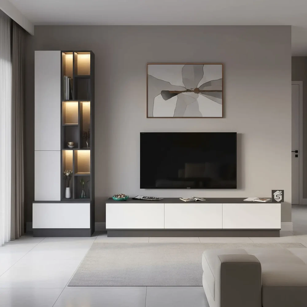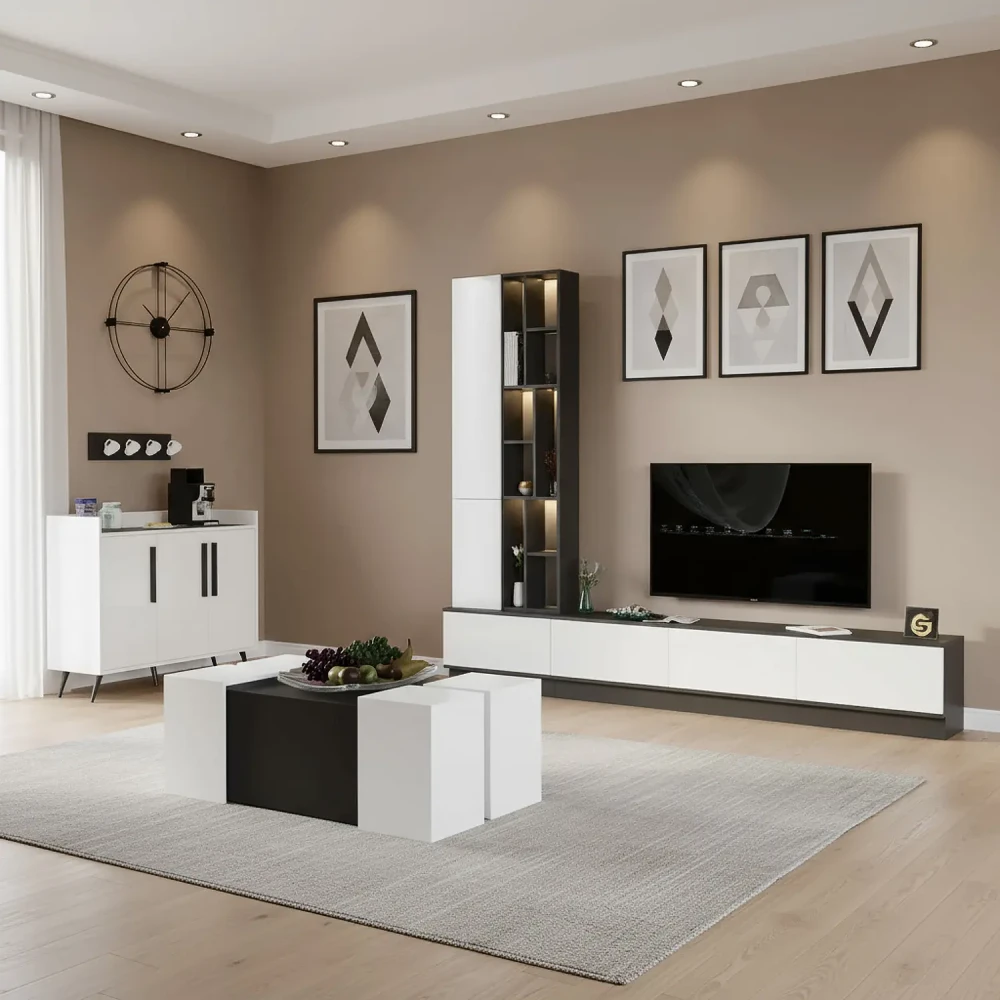 أضف لمسة من التميز والرقي إلى منزلك مع هذا الطقم العصري بألوان الأبيض والرمادي الهادئة. صُمم ليجمع بين الأناقة والعملية، ويوفر حلول تخزين ذكية ومساحات متعددة الاستخدامات، مما يجعله خيارًا مثاليًا يلبي احتياجاتك اليومية ويناسب مختلف أنماط الديكور.