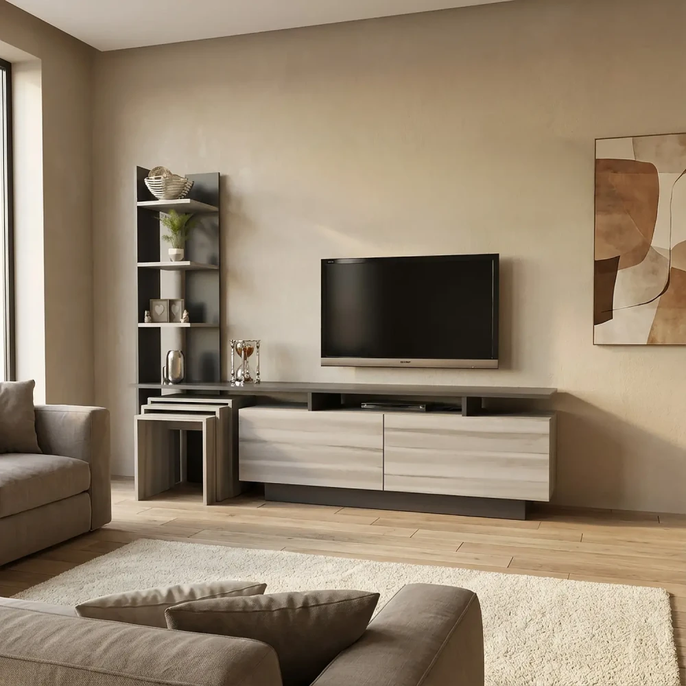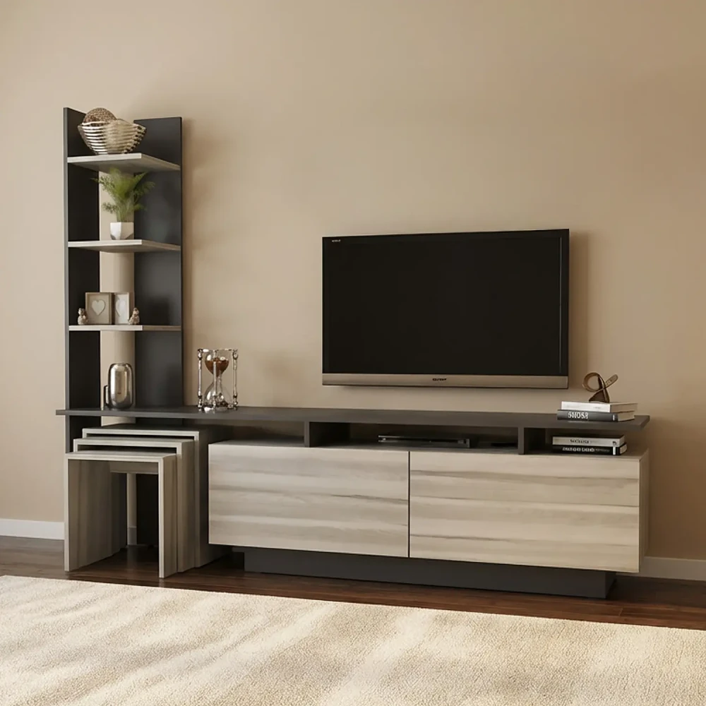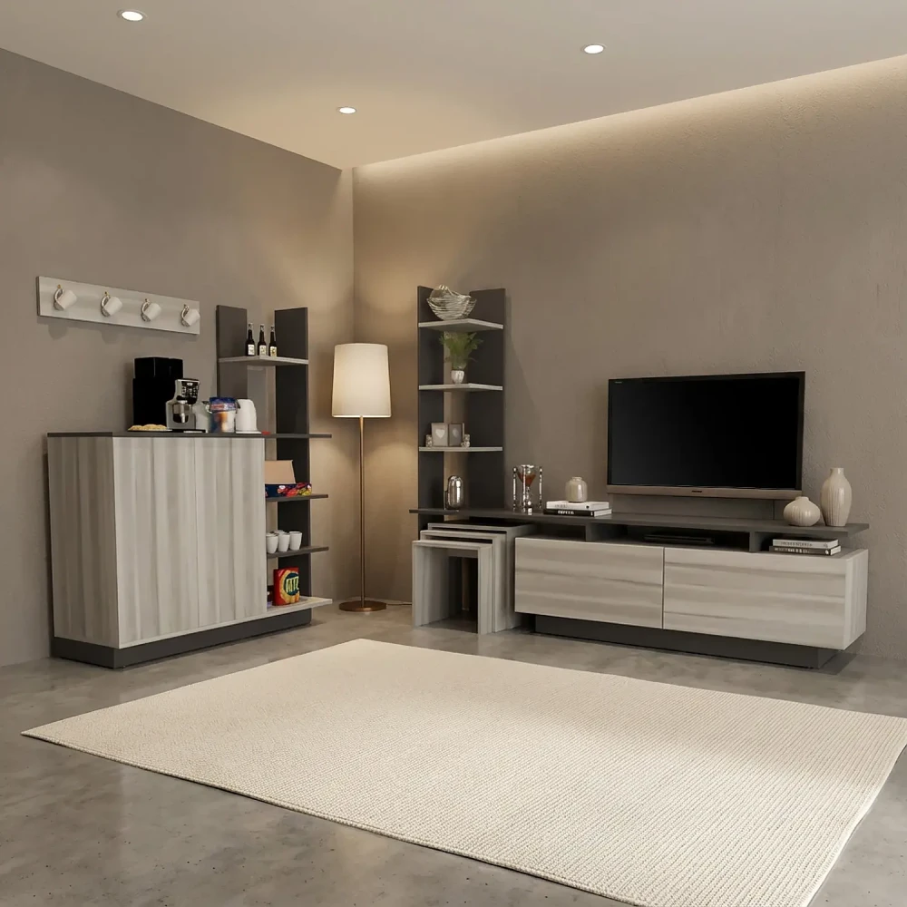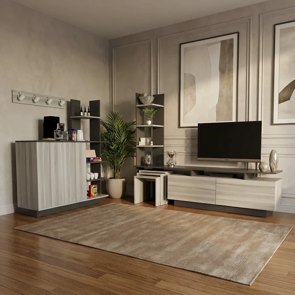 طقم طاولات لون رمادي درجتين، ويتكون هذا الطقم من طاوله تلفزيون، تحتوي علي درفتان، ورف مفتوح لوضع اجهزة الاستقبال، واجهزة الالعاب، وثلاثة أرفف على الجانب الايسر، بألاضافة الي 3 طاولات خدمة، مصمم لها مكان للتخزين بالطاولة، وركن قهوة به اربعة أرفف ودرفتان، وهو مصمم لللاستخدام العملى.