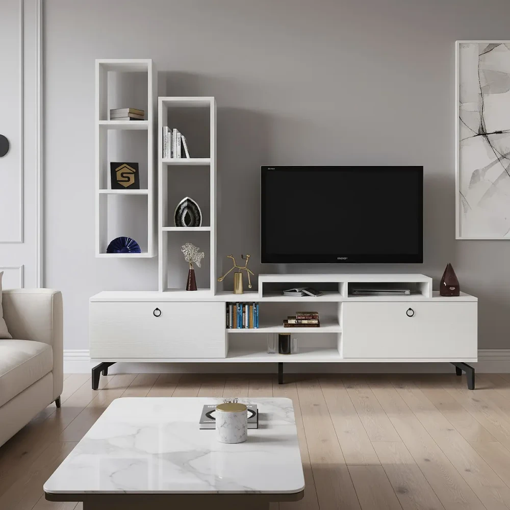 مكتبة تلفزيون حديثة تصميم تركي، تم تصميم هذه المكتبه باللون الابيض، بطابع تركى جديد، وتتكون مكتبه التلفزيون من درفتين كبيرتين على الجانبين، ورفين مفتوحين فى المنتصف، لوضع الاغراض او الكتب فيه، وقطعة وسطى أسفل الشاشة وفوق الطاولة مباشرة متحركة ويمكن الاستغناء عنها، وعند وضعها تكون رفين مفتوحين لسهوله تمرير الاسلاك الخاصه باجهزه التحكم عن بعد واجهزه الالعاب، ليعطيها استخدام امثل، وقطعتين على شكل مستطيل، بكل واحده  ثلاثه ارفف، تعلق على الجدار ويمكن وضع التحف فيها، او استخدامهم فى اغراض اخرى، بالاضافه الى رف اوسط يمكن تعليقه فوق الشاشه ويكتمل بها الشكل .